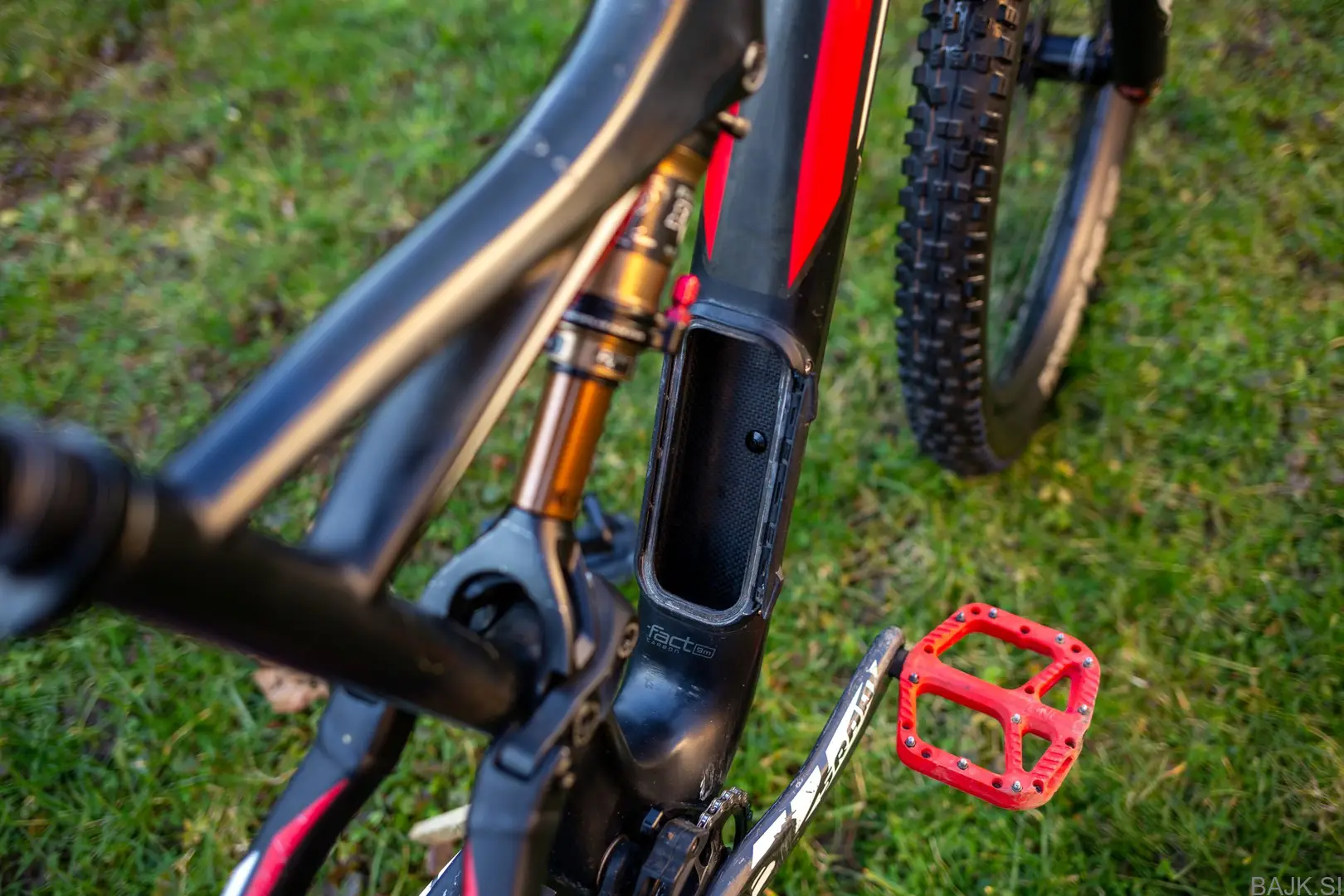 Karbonski okvir v L velikosti z aluminijastim zadnjim trikotnikom.