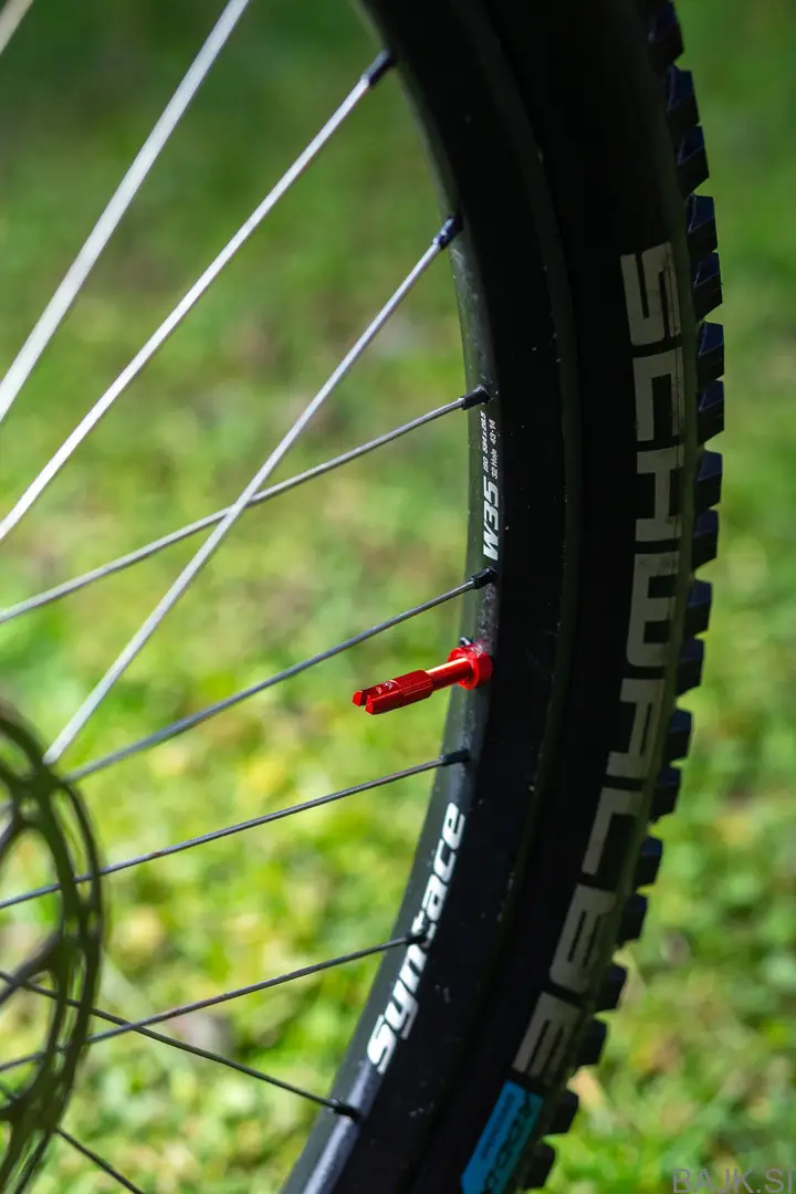 Obročniki Syntace w35 27.5", 28.5mm notranja širina, narejen tubeless s Peaty ventili.